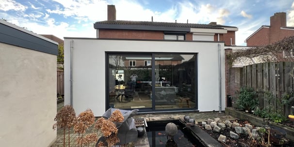 Functionele prefab aanbouw met strak pleisterwerk. In Lent hebben we deze uitbreiding gerealiseerd met oog voor comfort en daglicht.
